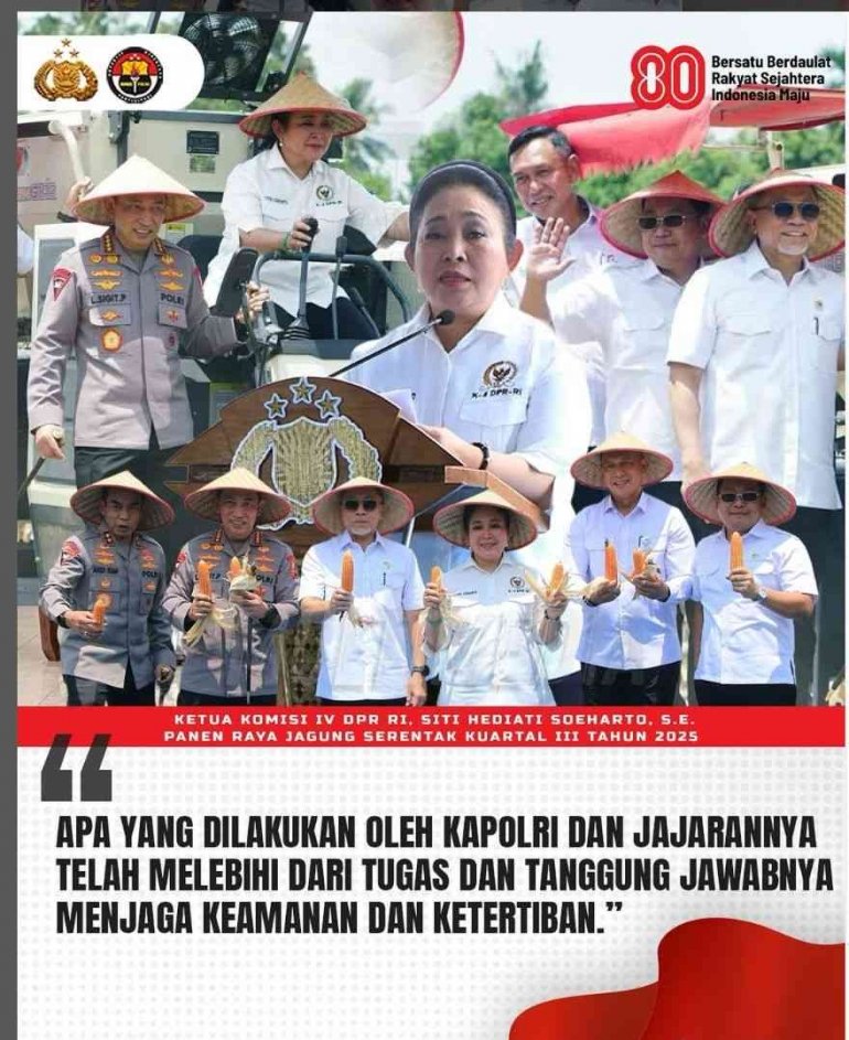 Di tengah semangat panen, Siti Hediati juga mengajak seluruh masyarakat untuk terus mendukung program pemerintah dan aparat, khususnya Polri, yang telah menjaga ruang hidup bersama agar tetap aman, damai, dan produktif.